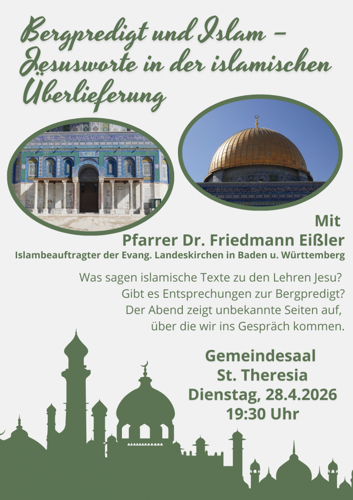 Am Dienstag, 28.04.2026, kommt der Islambeauftragter der Evangelischen Kirche, Friedmann Eißler, in den Gemeindesaal St. Theresia. Im Rahmen der Erwachsenenbildung spricht er darüber, was uns islamische Texte zu den Lehren Jesu sagen und ob es Entsprechungen in der Bergpredigt gibt.