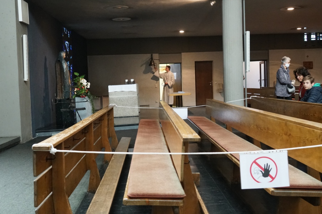 Gut organisiert zeigte sich die Salvatorgemeinde am Sonntag bei dem ersten Gottesdienst nach einer 8-wöchigen Pause. Ministranten mit Mundschutz kontrollierten am Eingang die Eintrittsscheine und gaben Anweisungen für die Einnahme der Plätze. Der Mesner half mit, damit die Hygieneverordnungen eingehalten wurden. So nahmen die Gläubigen in der Kirche die ausgewiesenen Plätze ein und saßen verstreut im ganzen Kirchenraum.