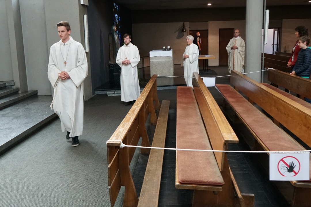 Gut organisiert zeigte sich die Salvatorgemeinde am Sonntag bei dem ersten Gottesdienst nach einer 8-wöchigen Pause. Ministranten mit Mundschutz kontrollierten am Eingang die Eintrittsscheine und gaben Anweisungen für die Einnahme der Plätze. Der Mesner half mit, damit die Hygieneverordnungen eingehalten wurden. So nahmen die Gläubigen in der Kirche die ausgewiesenen Plätze ein und saßen verstreut im ganzen Kirchenraum.