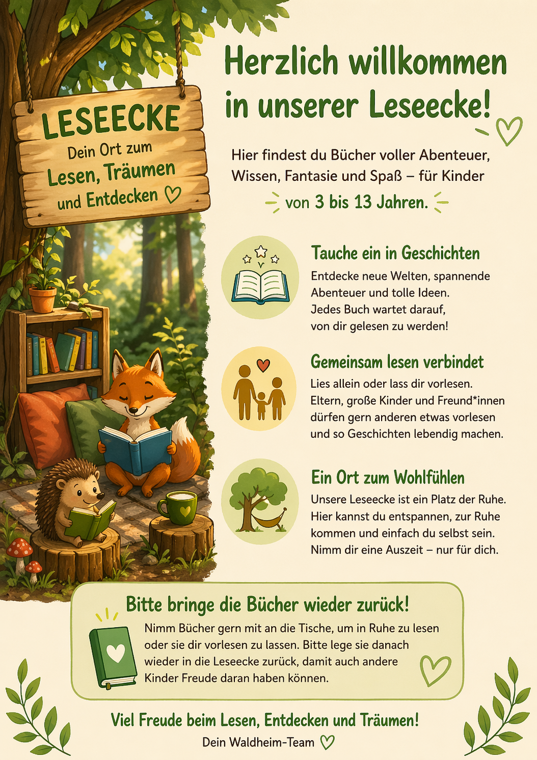 Mit unserer Initiative „Geschichten unter Bäumen“ möchten wir zusätzlich einen ruhigen Raum schaffen – einen Ort zum Schmökern, Vorlesen, Entdecken und Träumen.