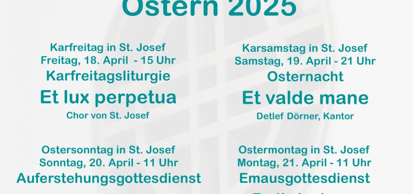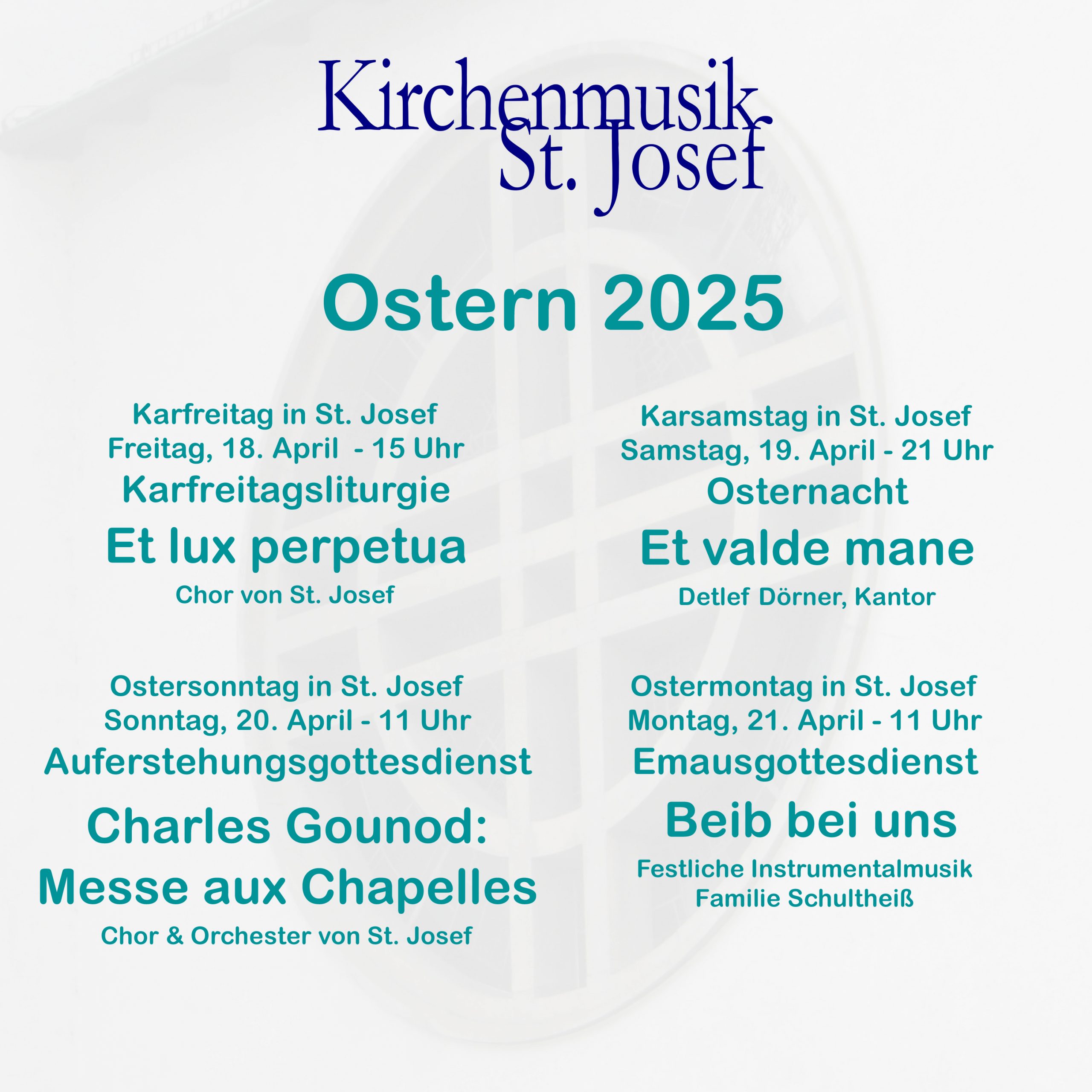 Die Feier der Osternacht am Karsamstag, den 19. April um 21 Uhr in St. Josef wird von der Choralschola gestaltet werden.