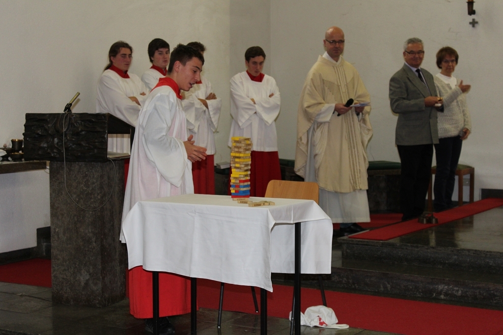 Im Anschluss waren alle Gottesdienstbesucher in den Gemeindesaal eingeladen, wo Pfarrer Hambücher deren Wissen über die Kirchengemeinden St. Theresia, St. Josef und Salvator beim „Großen Preis“ spielerisch auf die Probe stellte. Nach dem gemeinsamen Mittagessen waren sich alle einig: das war zweifellos ein sehr gelungener Sonntagvormittag.