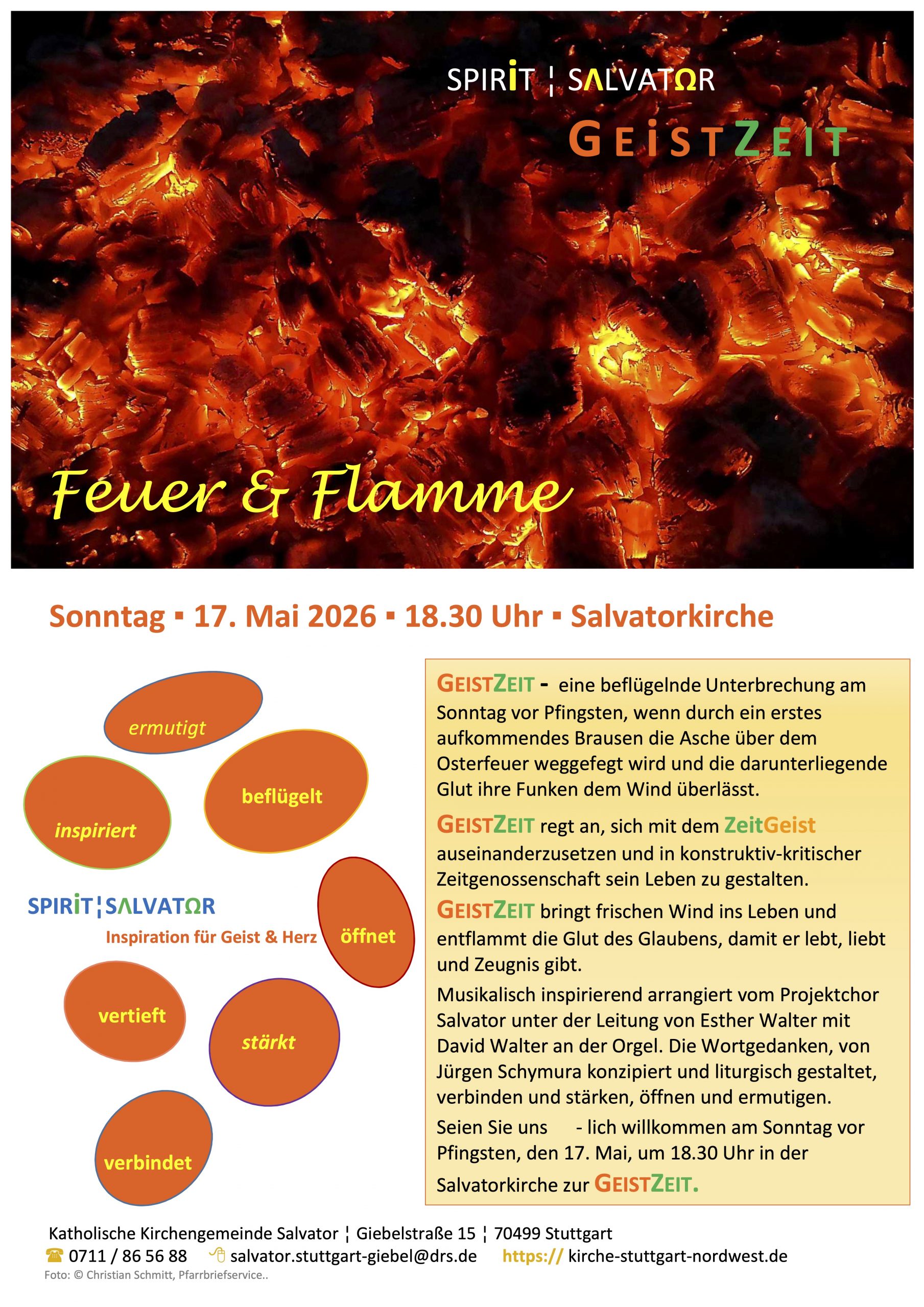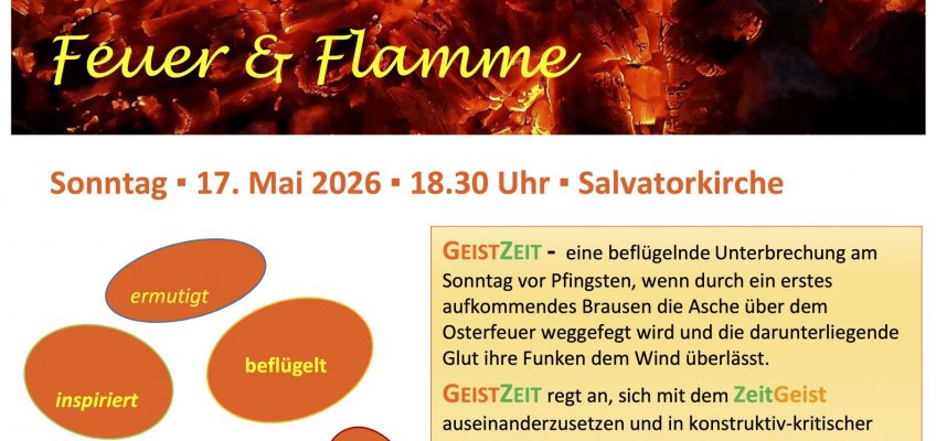 Seien Sie uns herzlich willkommen am Sonntag vor Pfingsten, den 17. Mai, um 18.30 Uhr in der Salvatorkirche zur GEISTZEIT.