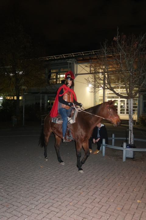 Nach einer kurzen Einführung durch Gemeindereferentin Theresia Mattes in der mit Kindern und Eltern, Omas und Opas, Onkel, Tanten und Geschwistern vollbesetzten Kirche St. Theresia machten sich die ca. 400 Teilnehmer mit ihren leuchtenden Laternen und mit dem Heiligen St. Martin auf dem Pferd in Richtung Wolfbuschschule auf. Auf dem Schulhof erlebten die Kinder mit ihren Eltern die Begegnung zwischen dem Heiligen Martin und dem Bettler, mit dem er seinen Mantel teilte und ihm zu essen gab. Im Anschluss daran wurden gebackene Martinsgänse gegen einen Spende zugunsten des Rubaga-Hospitals in Uganda verteilt.