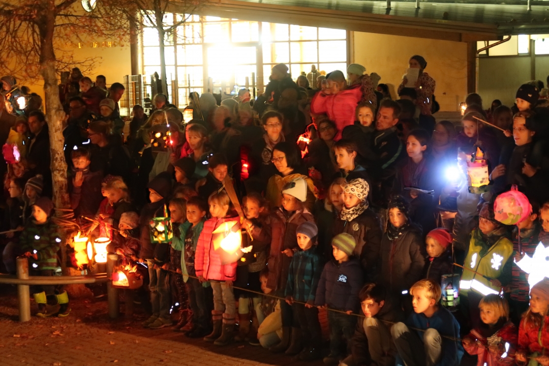 Nach einer kurzen Einführung durch Gemeindereferentin Theresia Mattes in der mit Kindern und Eltern, Omas und Opas, Onkel, Tanten und Geschwistern vollbesetzten Kirche St. Theresia machten sich die ca. 400 Teilnehmer mit ihren leuchtenden Laternen und mit dem Heiligen St. Martin auf dem Pferd in Richtung Wolfbuschschule auf.  Auf dem Schulhof erlebten die Kinder mit ihren Eltern die Begegnung zwischen dem Heiligen Martin und dem Bettler, mit dem er seinen Mantel teilte und ihm zu essen gab. Im Anschluss daran wurden gebackene Martinsgänse gegen einen Spende zugunsten des Rubaga-Hospitals in Uganda verteilt.
