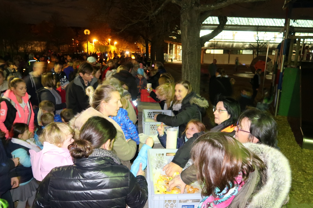 Nach einer kurzen Einführung durch Gemeindereferentin Theresia Mattes in der mit Kindern und Eltern, Omas und Opas, Onkel, Tanten und Geschwistern vollbesetzten Kirche St. Theresia machten sich die ca. 400 Teilnehmer mit ihren leuchtenden Laternen und mit dem Heiligen St. Martin auf dem Pferd in Richtung Wolfbuschschule auf.  Auf dem Schulhof erlebten die Kinder mit ihren Eltern die Begegnung zwischen dem Heiligen Martin und dem Bettler, mit dem er seinen Mantel teilte und ihm zu essen gab. Im Anschluss daran wurden gebackene Martinsgänse gegen einen Spende zugunsten des Rubaga-Hospitals in Uganda verteilt.