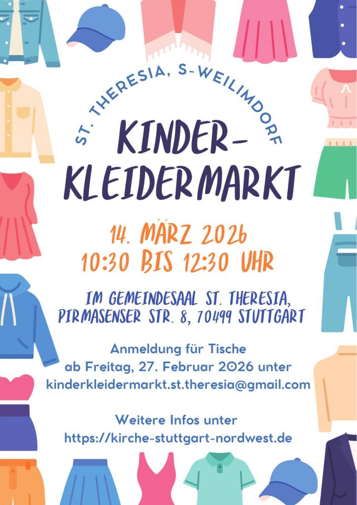 Am 14.3.2026 von 10.30 Uhr bis 12.30 Uhr werden im Gemeindesaal von Sankt Theresia Kinderkleidung, Kinderschuhe, Spielsachen und alles rund ums Kind verkauft. Verkäufer*innen können einen von 40 Tischen mieten und dort selbst ihre Sachen zum Verkauf anbieten. Außerdem gibt es selbstgemachte Kuchen, Brezeln und Getränke.