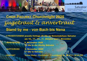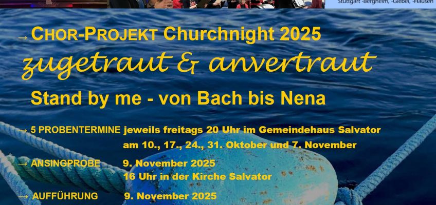 Die Proben finden freitags um 20 Uhr im Gemeindehaus Salvator statt, und zwar am 10., 17., 24. und 31. Oktober sowie am 7. November. Die Aufführung ist in der Churchnight am Sonntag, den 9. November um 17 Uhr in der Salvatorkirche, Ansingprobe um 16 Uhr.